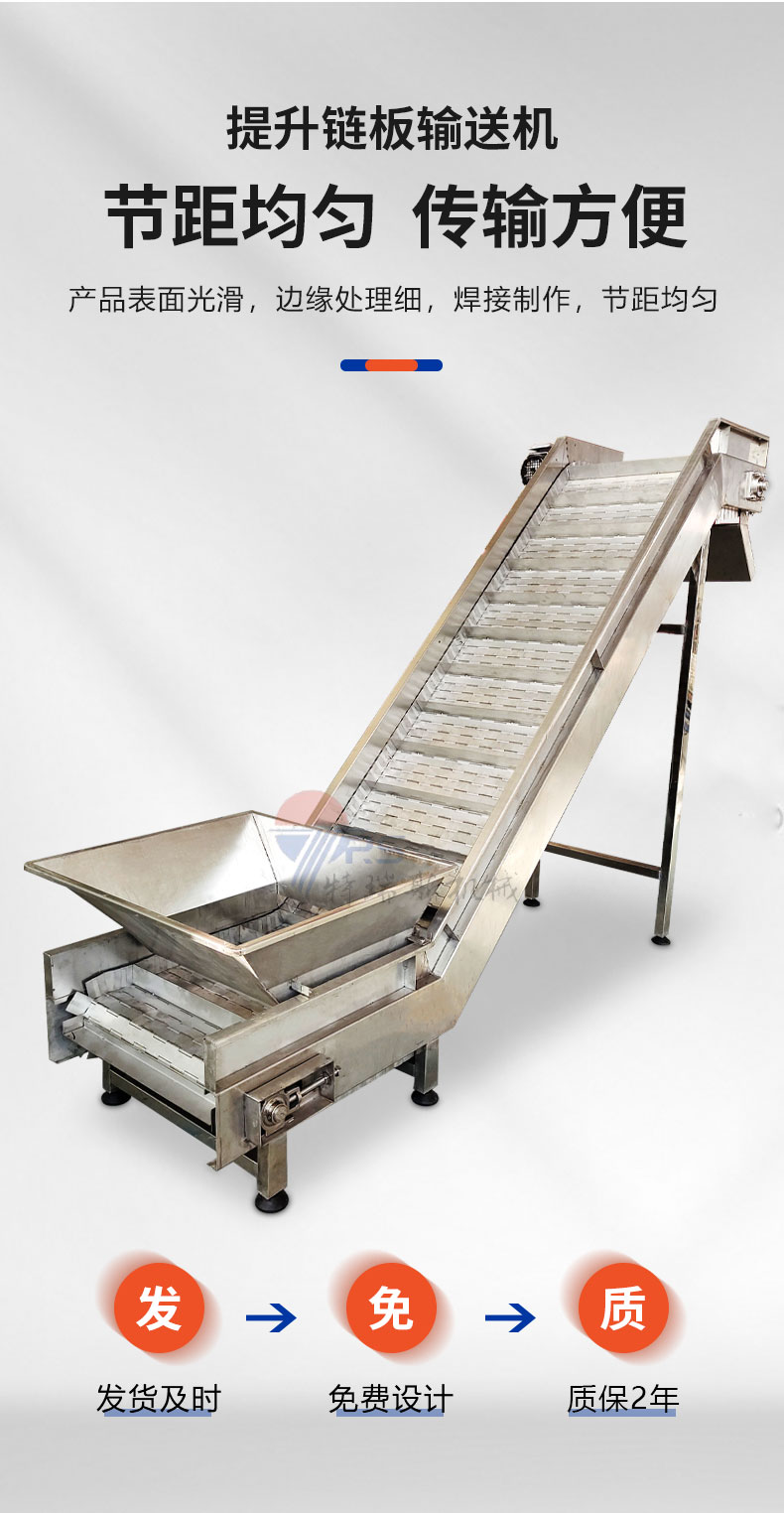 1、鏈板提升輸送機的輸送面平坦光滑,摩擦力小,物料在輸送線之間的過渡平穩,可輸送各種水果、禽肉以及各類玻璃瓶、PET瓶、易拉罐等物料,也可輸送各類箱包。